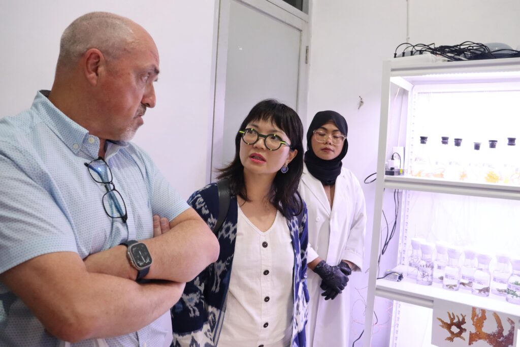 During the visit, the delegation toured UMCMB’s biobank, seaweed herbarium, and displays of innovative seaweed-based products developed by the center. Prof. Stella also brought along Prof. John from the University of California, Berkeley, who expressed particular interest in the biobank’s collection of wild Kappaphycus strains, recognizing its value for marine genetic research and sustainable development.