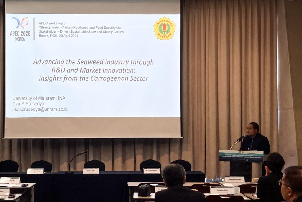 The University of Mataram Center for Marine Biorefineries (UMCMB) participated in the APEC Workshop 2025 held in Busan, South Korea, under the theme “Strengthening Climate Resilience and Food Security via Stakeholder-Driven Sustainable Seaweed Supply Chains.” The workshop was organized by APEC, in collaboration with the Ministry of Oceans and Fisheries of Korea and the Korea Maritime Institute.
