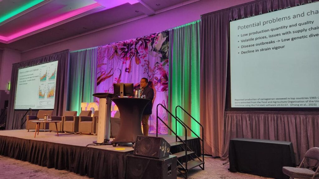 Assoc. Prof. Dr. Eka Sunarwidhi Prasedya from UMCMB delivered a scientific contribution focused on the Exploration wild Eucheumatoids Genetic Diversity in Indonesian coastal regions. His presentation emphasized the importance of characterizing natural populations to support biodiversity conservation, sustainable utilization, and future strain improvement for the seaweed industry.
